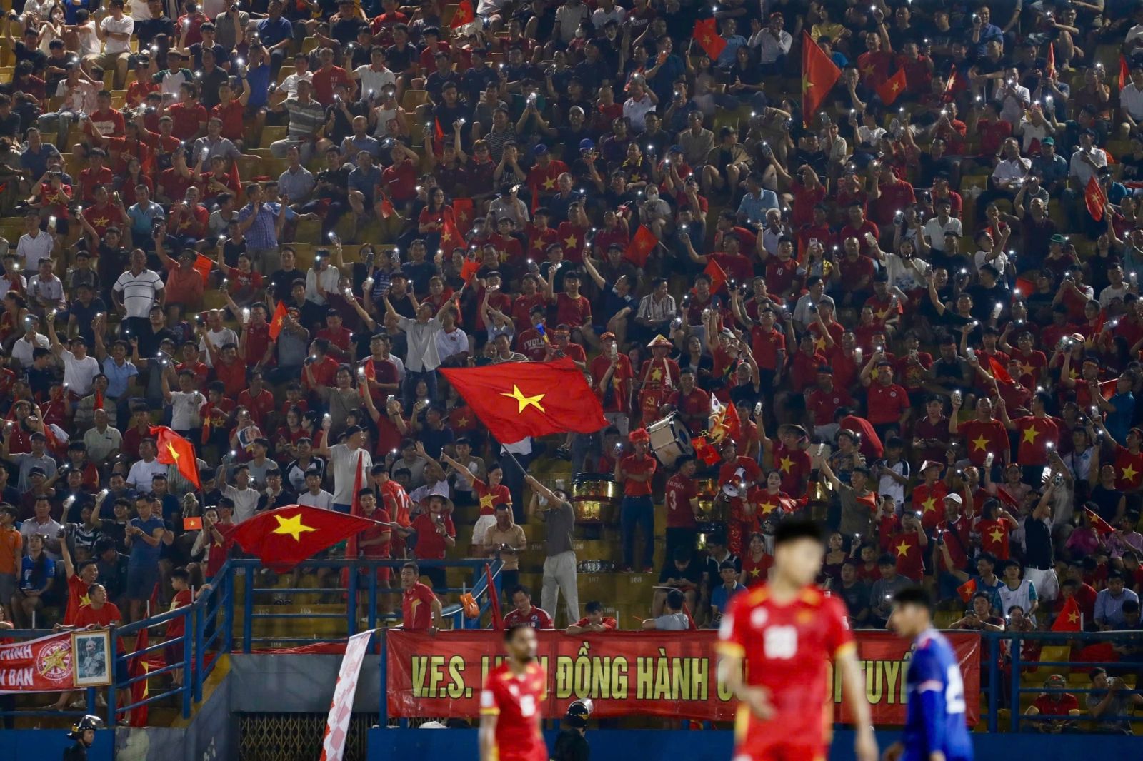 Cổ động viên Việt Nam phủ đỏ khán đài, tạo nên bầu không khí rực rỡ chiến thắng