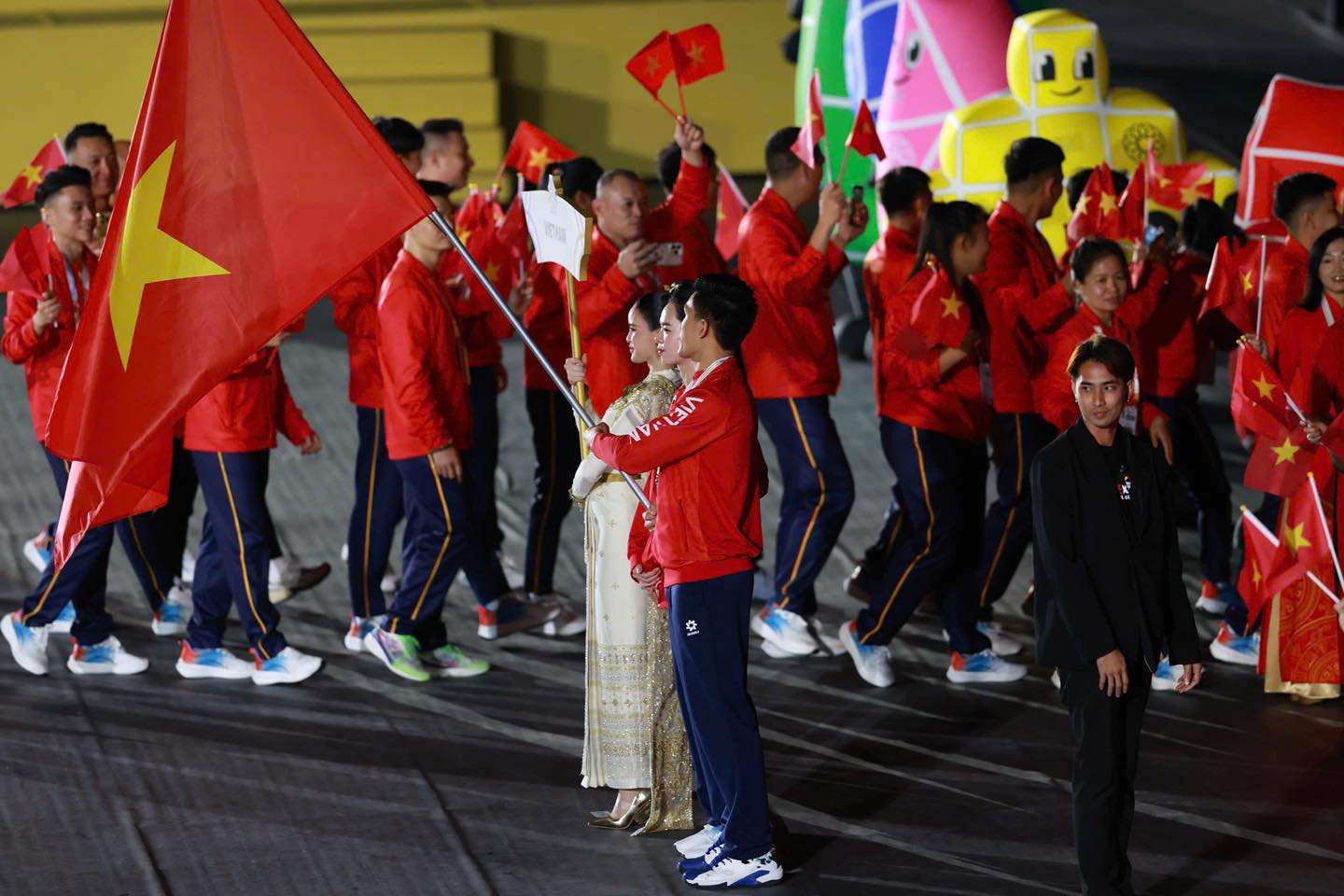 Trong luồng ánh sáng rực rỡ, âm nhạc sôi động và màu cờ sắc áo hòa lẫn, khoảnh khắc đoàn Việt Nam diễu hành vào sân dưới tiếng reo vang dội vang lên như một lời tuyên bố mạnh mẽ: “Chúng tôi đến, để thi đấu vì tự hào Tổ quốc”.