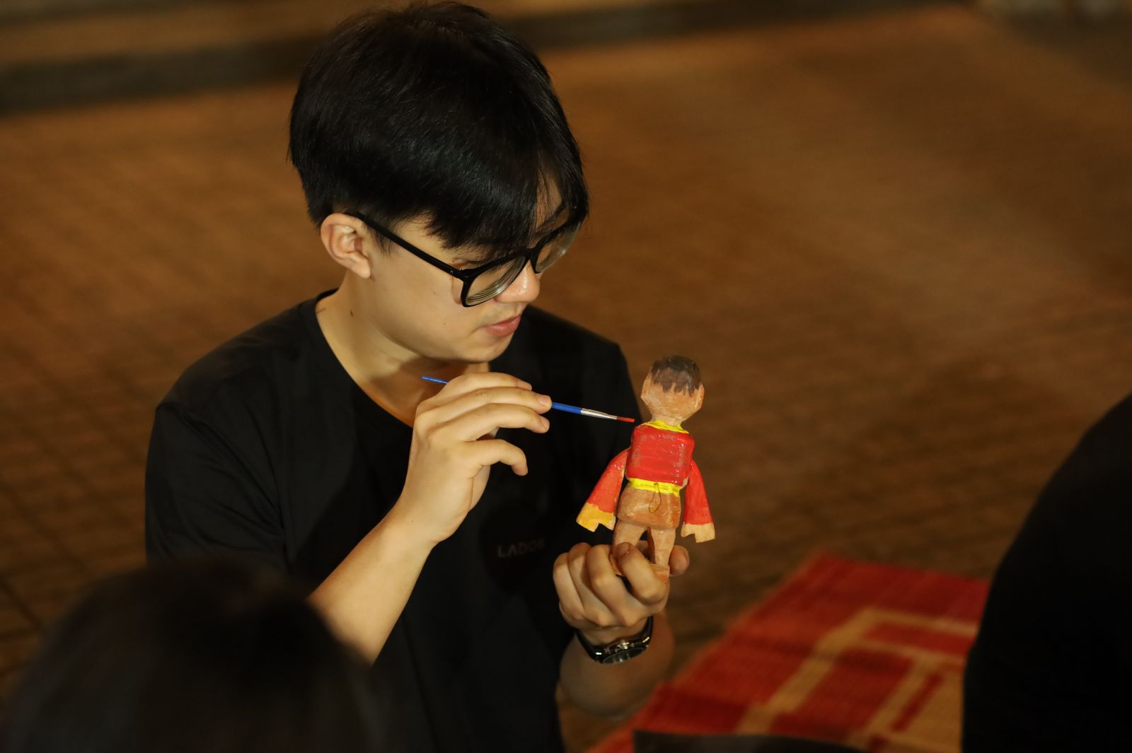 Một trong những hoạt động tạo được nhiều hứng thú là khu “Họa màu trên rối mộc”. Tại đây, những con rối chưa hoàn thiện được trao cho người tham gia như một phôi sáng tạo, để mỗi cá nhân tự do lựa chọn màu sắc và cách thể hiện. Quá trình tự tay tô vẽ không chỉ mang tính trải nghiệm thị giác mà còn giúp người trẻ hình dung rõ hơn về cấu trúc, tạo hình và ngôn ngữ biểu đạt của rối truyền thống, từ đó hình thành mối liên kết gần gũi hơn với nghệ thuật dân gian.